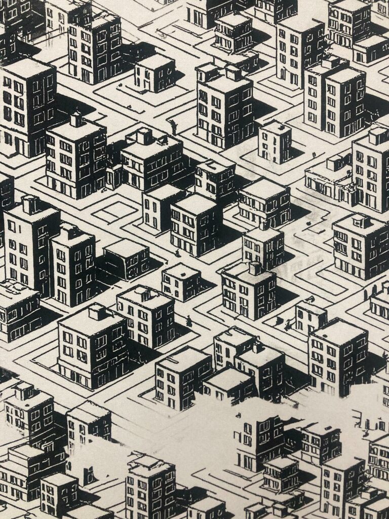 The exhibition continues with a new series of sculptural models that assemble fragments of a continuous peripheral city. Positioned midway between construction toys and the Architectons of Kazimir Malevich, these works present anonymous, repetitive, and functional buildings—shopping centers, hangars, blocks, and small apartment towers—that belong to no specific place. Hovering above these architectures is a “supreme” layer composed of advertisements, monumental structures, and slogan-bearing supports that convey vague promises, ambiguous hopes, or absurd prohibitions. Their sometimes humorous tone reveals an underlying will to control, whose apparent lightness proves unsettling.